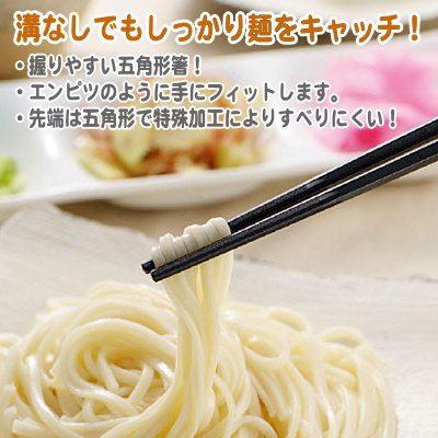 ◆溝なしでもしっかり麺をキャッチ!箸先の角を強調した特殊な 五角形の星型形状により、滑りやすいものや細かいものでも 楽につまめます。